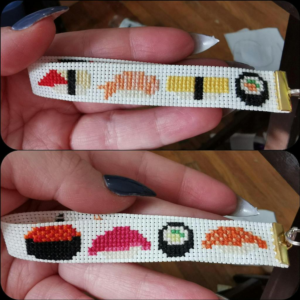 Patterns worked great on a towel. Easy to follow. I found the alignment of the sushi pieces a bit inconsistent, so I made all of them align to the same bottom line, rather than having some of the pieces float a line higher.